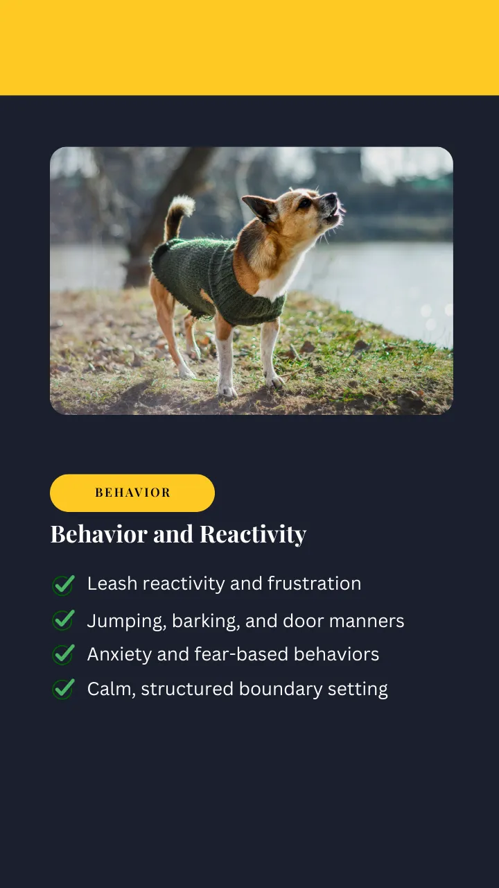 We help owners learn how to lead their dogs with clarity and consistency so they can enjoy a calmer, well-behaved companion.